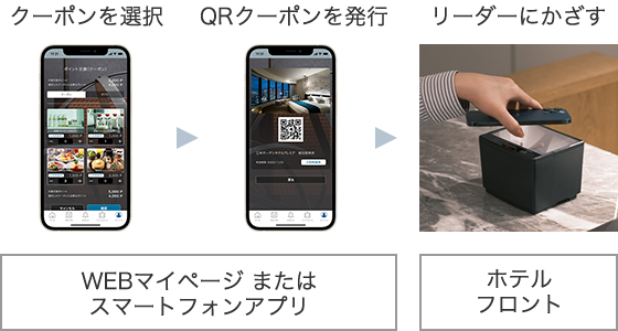 ご宿泊時 にご利用いただける、お得な各種クーポンにご引き換えいただけます。交換されたクーポンは、宿泊当日ホテルフロントスタッフにご提示ください。(※2)
